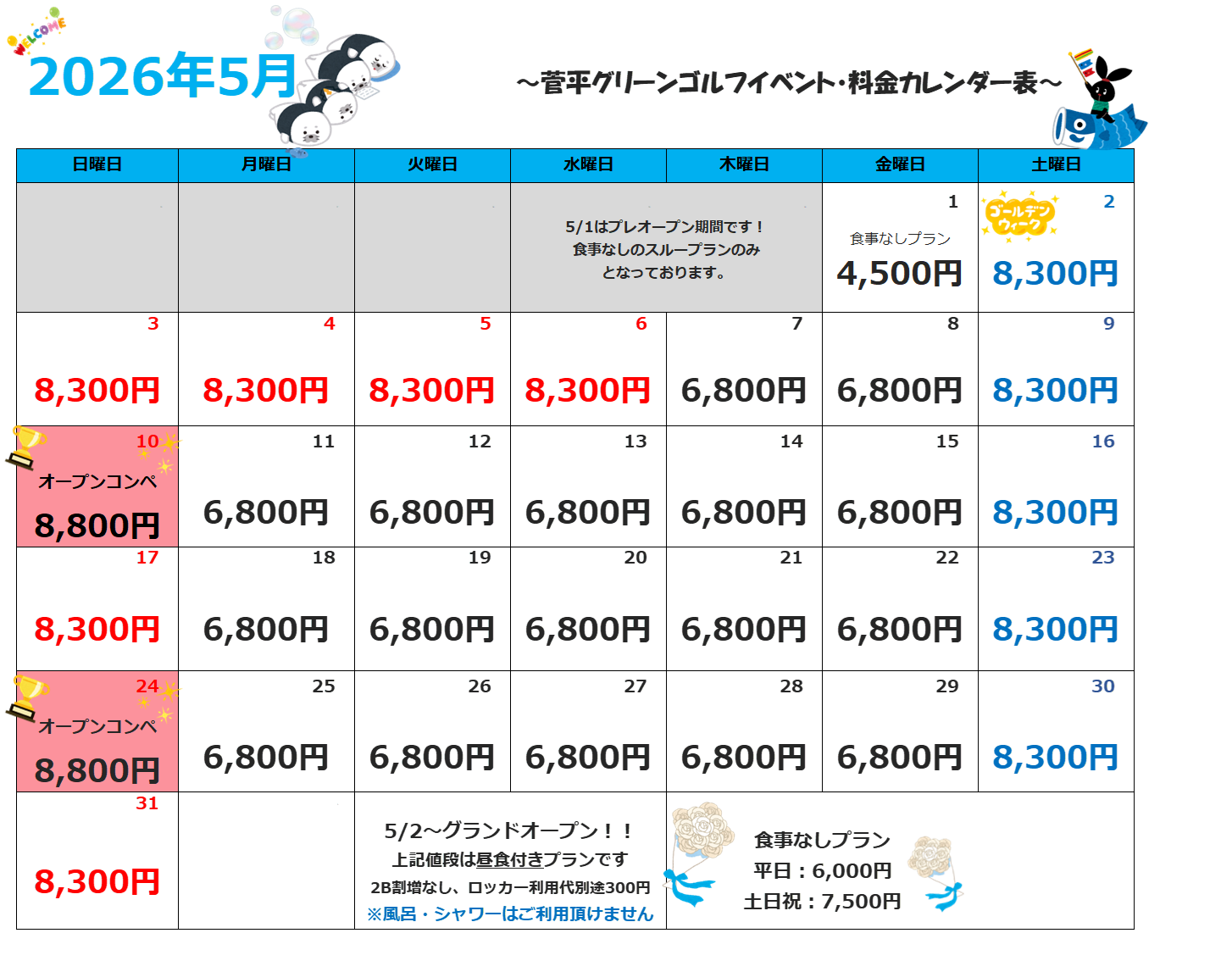 月々の料金の詳細は、クラブハウス内に掲示されているものをご確認ください。